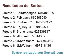 Lista de participantes: Fcbjuanlu 660868040, Bruno_bmw 625839937, JMWolfrahm 697518436, Felixitoborges- 601401225, Pontaeri_20 / 645852122, JMWolfrahm - 627386116, alf_dae7 677314352, Er_Mey23 609985371.