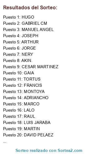 Lista de participantes: RAUL, JORGE, LUIS JARABA, MARCO, DIEGO, DAVID PELAEZ, TORRES FERCHO, SERRANO, KEVIN, GABRIEL CM, HUGO, ADRIANCHO, CASSIANI, OLARTE, MONTOYA, NOGUERA, FERIA, JAIR, JHON, ISRAEL, MANUEL ANGEL, TORTUS, FRANCIS, OSCAR, GAIA, CESAR MARTINEZ, LALO, JOSEPH, MARTIN, NERY, BETINHO, TEO, CAPDEVILLA, ARTHUR, AKIN..