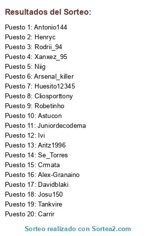 Lista de participantes: Alex-Granaino, Rodrii_94, Huesito12345, Aritz1996, Ivi, Niig, Robetinho, Crmata, Juniordecodema, Josu150, Antonio144, Davidblaki, Tankvire, Se_Torres, Cliosporttony, Xanxez_95, Henryc, Astucon, Carrir, Arsenal_killer.