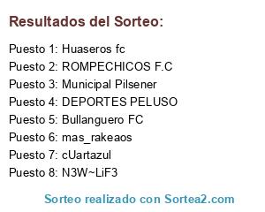 Lista de participantes: cUartazul, Huaseros fc, DEPORTES PELUSO, ROMPECHICOS F.C, Bullanguero FC, mas_rakeaos, N3W~LiF3, Municipal Pilsener.