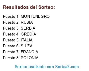 Lista de participantes: FRANCIA, RUSIA, GRECIA, SUIZA, ITALIA, POLONIA, SERBIA, MONTENEGRO.