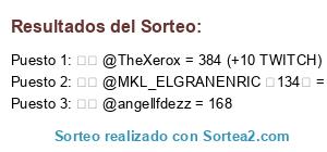 Lista de participantes: ➡️ @patrickyt = 8, ➡️ @albertoyeric. 23 = 321 (+20 TWITCH), ➡️ @Kleer = 833, ➡️ @Yit'samurai = 253, ➡️ @! ImMrJ0rg3 ⚡131⚡ = 37 (+10 TWITCH), ➡️ @Caramelo ⚡136 ⚡ = 40, ➡️ @MKLsongoki90⚡130⚡ = 104 (+20 TWITCH), ➡️ @TheXerox = 384 (+10 TWITCH), ➡️ @angellfdezz = 168, ➡️ @nata = 5, ➡️ @Calvejoo = 174 (+20 TWITCH), ➡️ @Fabian_10513 ⚡130⚡ = 2, ➡️ @chokoa3k = 318, ➡️ @Eren el caliente = 10, ➡️ @pablodechill = 10, ➡️ @skafjwjfna = 296, ➡️ @MKL_Izan_jc ⚡130⚡ = 16 (+20 TWITCH), ➡️ @MKL_ELGRANENRIC ⚡134⚡ = 143 (+20 TWITCH), ➡️ @🎮PIKATSM🎮 = 30, ➡️ @! HopeSosa友 = 570, ➡️ TANIA = 27, ➡️ @mike el lobo de colores = (+10 TWITCH), ➡️ @El diarreo = 100, ➡️ @fr6n = 182, ➡️ @Bandido_666_ = 48 (+20 TWITCH) ➡️ @The-Foxy = 24.