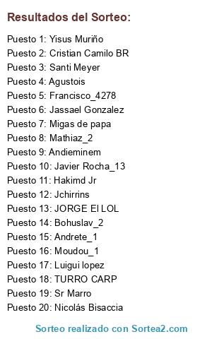 Lista de participantes: Cristian Camilo BR, Moudou_1, Luigui lopez, Mathiaz_2, Andieminem, TURRO CARP, Yisus Muriño, Javier Rocha_13, Francisco_4278, Bohuslav_2, Jchirrins, Hakimd Jr, Agustois, Jassael Gonzalez, Andrete_1, Sr Marro, JORGE El LOL, Santi Meyer, Migas de papa, Nicolás Bisaccia.