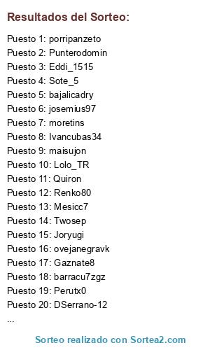 Lista de participantes: PabloDhb, Lolo_TR, Ivancubas34, maisujon, RubifumY, Sote_5, porripanzeto, Besky09, robertito2356, Twosep, Joryugi, moretins, bajalicadry, Gaznate8, barracu7zgz, Ortega178, DSerrano-12, Torets55, josemius97, Mesicc7, Marc5anna, Eddi_1515, roberrs777, XankeRocker, Seriko, Perutx0, Quiron, Punterodomin, ovejanegravk, Renko80.