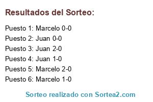 Lista de participantes: Juan 90', Marcelo 90', Juan Prorroga, Marcelo Prorroga, Juan Penales, Marcelo Penales.