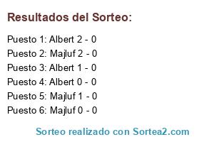 Lista de participantes: Albert 2 - 0, Majluf 2 - 0, Albert 1 - 0, Majluf 1 - 0, Albert 0 - 0, Majluf 0 - 0.