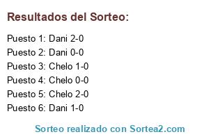 Lista de participantes: Chelo 0-0, Dani 0-0, Chelo 1-0, Dani 1-0, Chelo 2-0, Dani 2-0.