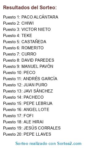 Lista de participantes: CURRO, VICTOR NIETO, FOFI, PEPE LLAVES, ANDRÉS GARCÍA, MANUEL PAVÓN, JESÚS CORRALES, ALE HIRAI, ROMERITO, JAVI SÁNCHEZ, CASTAÑEDA, PECO, JUAN PURO, DAVID PAREDES, TEKE, PACO ALCÁNTARA, CHIWI, PEPE LEBRIJA, PACHECO, ANGEL LOTE.