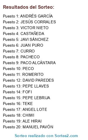 Lista de participantes: FOFI, CASTAÑEDA, ALE HIRAI, PEPE LLAVES, JAVI SÁNCHEZ, ANDRÉS GARCÍA, DAVID PAREDES, ANGEL LOTE, JUAN PURO, JESÚS CORRALES, ROMERITO, PACHECO, CHIWI, PEPE LEBRIJA, CURRO, VICTOR NIETO, MANUEL PAVÓN, PECO, PACO ALCÁNTARA, TEKE.