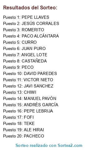 Lista de participantes: CURRO, PEPE LEBRIJA, CHIWI, PECO, MANUEL PAVÓN, ALE HIRAI, PACO ALCÁNTARA, TEKE, FOFI, ROMERITO, JESÚS CORRALES, CASTAÑEDA, ANGEL LOTE, PACHECO, VICTOR NIETO, DAVID PAREDES, ANDRÉS GARCÍA, JAVI SANCHEZ, JUAN PURO, PEPE LLAVES.