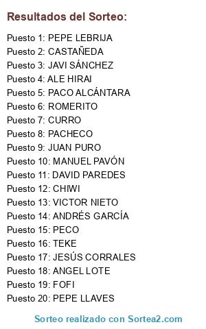 Lista de participantes: ALE HIRAI, FOFI, TEKE, MANUEL PAVÓN, CASTAÑEDA, CHIWI, CURRO, PEPE LLAVES, ROMERITO, ANDRÉS GARCÍA, JESÚS CORRALES, PACO ALCÁNTARA, PECO, ANGEL LOTE, PACHECO, JAVI SÁNCHEZ, DAVID PAREDES, JUAN PURO, PEPE LEBRIJA, VICTOR NIETO.