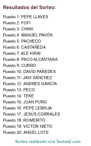 Lista de participantes: PEPE LEBRIJA, JAVI SÁNCHEZ, CASTAÑEDA, ROMERITO, ALE HIRAI, PACO ALCÁNTARA, PACHECO, MANUEL PAVÓN, CURRO, CHIWI, VICTOR NIETO, JUAN PURO, DAVID PAREDES, ANDRÉS GARCÍA, PECO, TEKE, ANGEL LOTE, JESÚS CORRALES, FOFI, PEPE LLAVES.