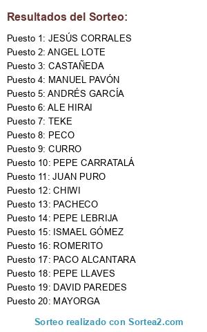 Lista de participantes: JUAN PURO, ALE HIRAI, PEPE LLAVES, PACHECO, PECO, MAYORGA, ANGEL LOTE, PEPE LEBRIJA, CURRO, ANDRÉS GARCÍA, PEPE CARRATALÁ, CASTAÑEDA, DAVID PAREDES, MANUEL PAVÓN, ISMAEL GÓMEZ, CHIWI, JESÚS CORRALES, PACO ALCANTARA, ROMERITO, TEKE.