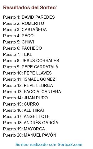 Lista de participantes: DAVID PAREDES, ANDRÉS GARCÍA, PEPE LEBRIJA, CURRO, JUAN PURO, TEKE, PEPE LLAVES, ROMERITO, CASTAÑEDA, PECO, PEPE CARRATALÁ, CHIWI, JESÚS CORRALES, ALE HIRAI, ISMAEL GÓMEZ, MAYORGA, PACO ALCANTARA, ANGEL LOTE, MANUEL PAVÓN, PACHECO.