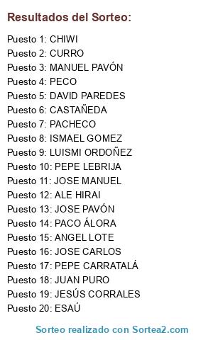 Lista de participantes: PACHECO, PEPE CARRATALÁ, ALE HIRAI, JESÚS CORRALES, JOSE CARLOS, ESAÚ, PACO ÁLORA, MANUEL PAVÓN, ANGEL LOTE, CHIWI, PEPE LEBRIJA, CURRO, ISMAEL GOMEZ, PECO, CASTAÑEDA, DAVID PAREDES, JOSE MANUEL, LUISMI ORDOÑEZ, JUAN PURO, JOSE PAVÓN.