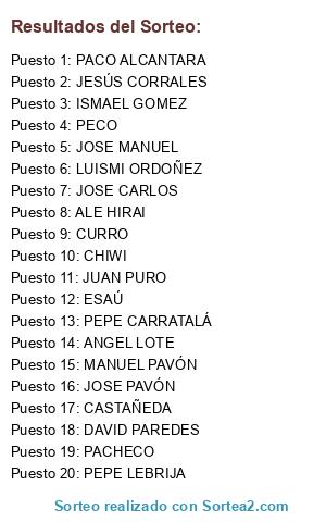 Lista de participantes: JOSE PAVÓN, PECO, JESÚS CORRALES, PEPE LEBRIJA, CURRO, JOSE CARLOS, DAVID PAREDES, PACO ALCANTARA, MANUEL PAVÓN, CHIWI, ISMAEL GOMEZ, ANGEL LOTE, PACHECO, ESAÚ, JOSE MANUEL, ALE HIRAI, PEPE CARRATALÁ, LUISMI ORDOÑEZ, JUAN PURO, CASTAÑEDA.