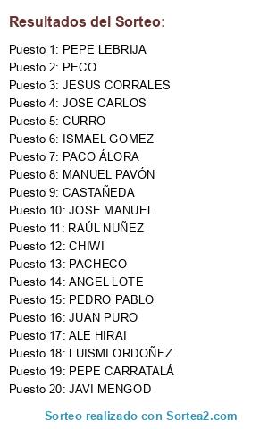 Lista de participantes: PEDRO PABLO, RAÚL NUÑEZ, PACHECO, CASTAÑEDA, CURRO, PACO ÁLORA, JOSE MANUEL, ISMAEL GOMEZ, ALE HIRAI, PEPE LEBRIJA, ANGEL LOTE, JESUS CORRALES, JUAN PURO, PEPE CARRATALÁ, PECO, JAVI MENGOD, LUISMI ORDOÑEZ, JOSE CARLOS, MANUEL PAVÓN, CHIWI.