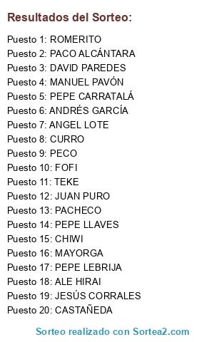 Lista de participantes: CHIWI, PECO, PACO ALCÁNTARA, ROMERITO, MAYORGA, CASTAÑEDA, FOFI, ALE HIRAI, MANUEL PAVÓN, PEPE CARRATALÁ, PEPE LEBRIJA, JESÚS CORRALES, PEPE LLAVES, DAVID PAREDES, ANGEL LOTE, JUAN PURO, PACHECO, ANDRÉS GARCÍA, CURRO, TEKE.