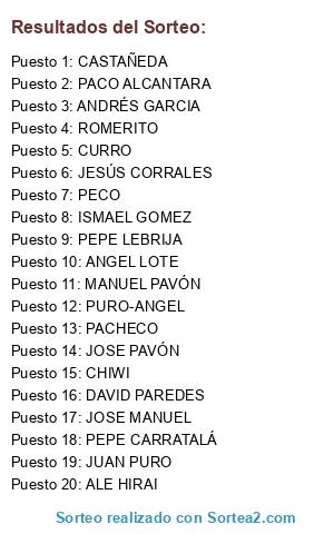 Lista de participantes: PEPE CARRATALÁ, MANUEL PAVÓN, DAVID PAREDES, PACO ALCANTARA, ROMERITO, PEPE LEBRIJA, ANDRÉS GARCIA, JOSE MANUEL, ALE HIRAI, JESÚS CORRALES, CASTAÑEDA, PURO-ANGEL, JOSE PAVÓN, ISMAEL GOMEZ, CHIWI, CURRO, PACHECO, PECO, JUAN PURO, ANGEL LOTE.