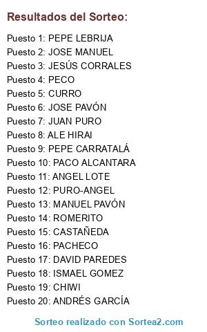 Lista de participantes: DAVID PAREDES, JOSE MANUEL, ANGEL LOTE, PEPE CARRATALÁ, JOSE PAVÓN, JUAN PURO, ALE HIRAI, ANDRÉS GARCÍA, PECO, PACO ALCANTARA, ROMERITO, ISMAEL GOMEZ, MANUEL PAVÓN, CASTAÑEDA, PURO-ANGEL, PACHECO, JESÚS CORRALES, CURRO, CHIWI, PEPE LEBRIJA.