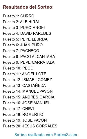 Lista de participantes: PURO-ANGEL, PEPE CARRATALÁ, CURRO, JOSE MANUEL, ISMAEL GOMEZ, ALE HIRAI, JUAN PURO, ANDRÉS GARCÍA, ANGEL LOTE, PECO, DAVID PAREDES, CASTAÑEDA, CHIWI, PACHECO, ROMERITO, JESUS CORRALES, PACO ALCANTARA, JOSE PAVÓN, MANUEL PAVÓN, PEPE LEBRIJA.