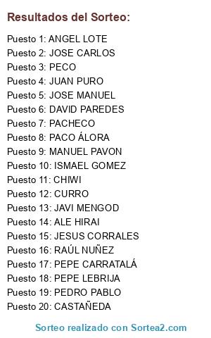 Lista de participantes: PEDRO PABLO, RAÚL NUÑEZ, DAVID PAREDES, JAVI MENGOD, PEPE CARRATALÁ, MANUEL PAVON, CASTAÑEDA, JESUS CORRALES, JOSE CARLOS, ANGEL LOTE, PEPE LEBRIJA, PECO, JOSE MANUEL, JUAN PURO, ALE HIRAI, PACO ÁLORA, CURRO, CHIWI, PACHECO, ISMAEL GOMEZ.