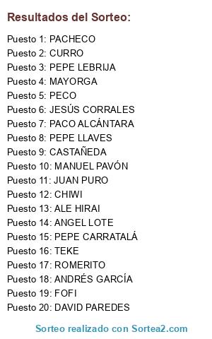 Lista de participantes: PEPE CARRATALÁ, MANUEL PAVÓN, PACHECO, DAVID PAREDES, JESÚS CORRALES, ANDRÉS GARCÍA, CURRO, ANGEL LOTE, ALE HIRAI, CHIWI, TEKE, PEPE LLAVES, ROMERITO, JUAN PURO, MAYORGA, CASTAÑEDA, PECO, PEPE LEBRIJA, PACO ALCÁNTARA, FOFI.