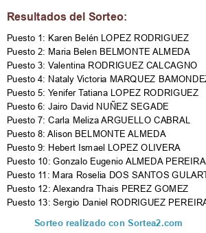 Lista de participantes: Gonzalo Eugenio ALMEDA PEREIRA, Carla Meliza ARGUELLO CABRAL, Maria Belen BELMONTE ALMEDA, Alison BELMONTE ALMEDA, Mara Roselia DOS SANTOS GULARTE, Martina Melany DUERA APOLINARIO, Rosmari FERNANDEZ CASTRO, Gloria Estefa GONZALEZ RODRIGUEZ, Katerine Fiore LARROSA FERNÁNDEZ, Ana Paula LEIVAS COLMAN, Hebert Ismael LOPEZ OLIVERA, Karen Belén LOPEZ RODRIGUEZ, Yenifer Tatiana LOPEZ RODRIGUEZ, Nataly Victoria MARQUEZ BAMONDEZ, Jairo David NUÑEZ SEGADE, Carolina Belen NUÑEZ SOSA, Alexandra Thais PEREZ GOMEZ, Sergio Daniel RODRIGUEZ PEREIRA, Tatiana Gimena SEGADE MEDEROS, Jose LuisSILVERA FERREIRA, José Elias SILVERA SILVA, Alinson Fernanda SOSA FERREIRA, Bibi Marianela TECHERA LEIVAS, Natalia Katerine TECHERA SABETTA, Valentina RODRIGUEZ CALCAGNO.