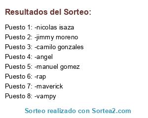 Lista de participantes: -rap, -maverick, -jimmy moreno, -nicolas isaza, -manuel gomez, -angel , -camilo gonzales, -vampy.