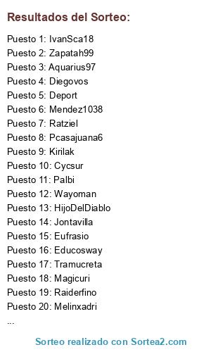 Lista de participantes: Adri44, AlbertoPantani, Aleixitu08, Alepere, Aquarius97, Cycsur, Deport, Diegovos, Elhoir, Eufrasio, Educosway, Guifiti123, Heyibiza, HijoDelDiablo, Ipom, IvanSca18, Jontavilla, Kirilak, Magicuri, Melinxadri, Mendez1038, Migsiemar99, Palbi, Pcasajuana6, Raiderfino, Raulbanqueri, Ratziel, Tramucreta, Wayoman, Zapatah99.