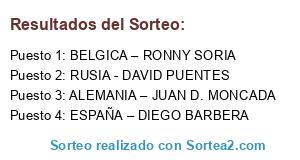Lista de participantes: ESPAÑA – DIEGO BARBERA, BELGICA – RONNY SORIA, RUSIA - DAVID PUENTES, ALEMANIA – JUAN D. MONCADA.