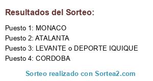 Lista de participantes: CORDOBA, LEVANTE o DEPORTE IQUIQUE, MONACO, ATALANTA.