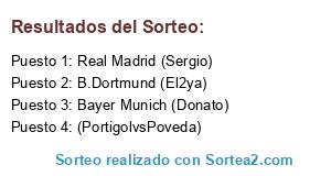 Lista de participantes: Real Madrid (Sergio), Bayer Munich (Donato), (PortigolvsPoveda), B.Dortmund (El2ya).