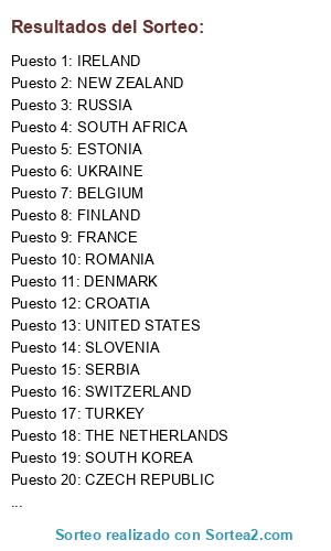 Lista de participantes: ALBANIA, AUSTRALIA, BELGIUM, CANADA, CHILE, CROATIA, CZECH REPUBLIC, DENMARK, ESTONIA, FINLAND, FRANCE, GERMANY, GREECE, IRELAND, ITALY, JAPAN, NEW ZEALAND, NORWAY, PHILIPPINES, PORTUGAL, ROMANIA, RUSSIA, SERBIA, SLOVENIA, SOUTH AFRICA, SOUTH KOREA, SPAIN, SWEDEN, SWITZERLAND, THE NETHERLANDS, TURKEY, UKRAINE, UNITED KINGDOM, UNITED STATES.
