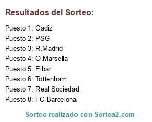 Lista de participantes: Eibar, O.Marsella, R.Madrid, Tottenham, PSG, FC Barcelona, Real Sociedad, Cadiz.