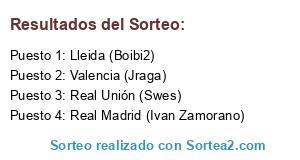 Lista de participantes: Valencia (Jraga), Real Unión (Swes), Real Madrid (Ivan Zamorano), Lleida (Boibi2).