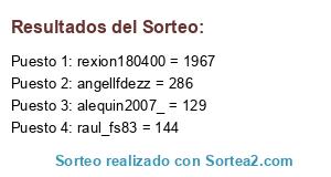 Lista de participantes: rexion = 1967, banqutoxd = 26, raul= 144, alequin = 129, angellfdezz = 286, thexerox = 993, mikeellobodecolores = 558, aitor = 37, bandido = 370, olivenza = 168.