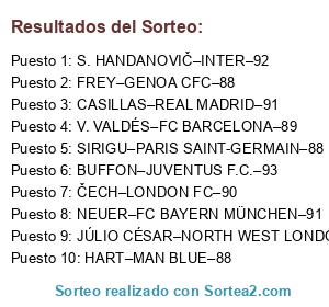 Lista de participantes: BUFFON–JUVENTUS F.C.–93, S. HANDANOVIČ–INTER–92, NEUER–FC BAYERN MÜNCHEN–91, CASILLAS–REAL MADRID–91, ČECH–LONDON FC–90, JÚLIO CÉSAR–NORTH WEST LONDON–90, V. VALDÉS–FC BARCELONA–89, FREY–GENOA CFC–88, HART–MAN BLUE–88, SIRIGU–PARIS SAINT-GERMAIN–88.