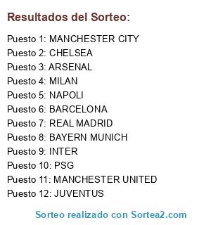 Lista de participantes: ARSENAL, CHELSEA, MANCHESTER CITY, MANCHESTER UNITED, PSG, JUVENTUS, MILAN, BAYERN MUNICH, BARCELONA, INTER, REAL MADRID, NAPOLI.