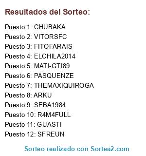 Lista de participantes: GUASTI, VITORSFC, SFREUN, MATI-GTI89, PASQUENZE, SEBA1984, CHUBAKA, ELCHILA2014, ARKU, THEMAXIQUIROGA, FITOFARAIS, R4M4FULL.