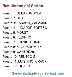 Lista de participantes: FARAON_CALAMAR, RENECOM, SEBARUGBYER, OOKIIO, JUANKSTIGMA, MOU27, ALVARADOMDP, CANTOR29, BLITZ, FEDINHO, LUISINHO_CRACK, JUGADOR SORTEO.