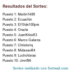 Lista de participantes: JuanKrlox83, Midasavi84, El10de100pre, Christorrq, Martin1489, Jmnf96, LuchoVaras, Ecuachin, Marco Galarza, Oracle.