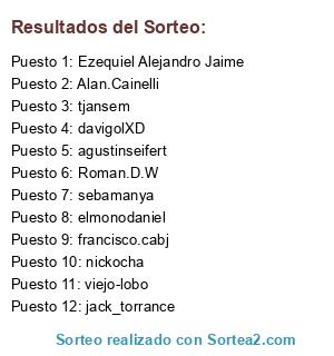 Lista de participantes: jack_torrance, agustinseifert, sebamanya, Ezequiel Alejandro Jaime, tjansem, Alan.Cainelli, francisco.cabj, viejo-lobo, nickocha, Roman.D.W, elmonodaniel, davigolXD.