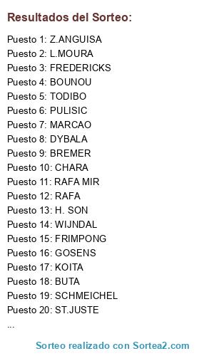 Lista de participantes: BOUNOU, SCHMEICHEL, ST.JUSTE, BREMER, BUTA, WIJNDAL, GOSENS, FREDERICKS, FRIMPONG, TODIBO, MARCAO, CHARA, LUIZ ARAUJO, Z.ANGUISA, PULISIC, DYBALA, RAFA, L.MOURA, KOITA, RAFA MIR, H. SON.
