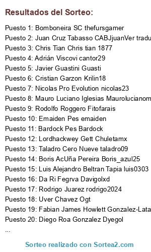 Lista de participantes: Boris AcUña Pereira Boris_azul25, Fabian James Howlett Gonzalez-Latapiatt Aguilar kist, Bardock Pes Bardock, Luis Alejandro Beltran Tapia luis0303, Rodolfo Roggero Fitofarais, Juan Cruz Tabasso CABJjuanVer traducción, Chris Tian Chris tian 1877, Nicolas Pro Evolution nicolas23, Cristian Garzon Krilin18, Lordhackwey Gett Chuletamx , Adrián Viscovi cantor29, Taladro Cero Nueve taladro09, Da Ri Fegrva Davigolxd, Rodrigo Rodrigo rodrigotav, Rodrigo Juarez rodrigo2024, Emaiden Pes emaiden, Uver Chavez Ogt, Javier Guastini Guasti, Mauro Luciano Iglesias Maurolucianoman, Diego Roa Gonzalez Dyegol , Bomboneira SC thefursgamer, Daniel Viscovi Danipro., .