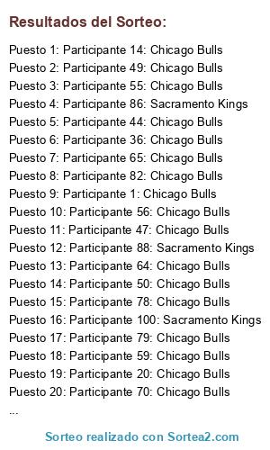 Lista de participantes: Participante 1: Chicago Bulls, Participante 2: Chicago Bulls, Participante 3: Chicago Bulls, Participante 4: Chicago Bulls, Participante 5: Chicago Bulls, Participante 6: Chicago Bulls, Participante 7: Chicago Bulls, Participante 8: Chicago Bulls, Participante 9: Chicago Bulls, Participante 10: Chicago Bulls, Participante 11: Chicago Bulls, Participante 12: Chicago Bulls, Participante 13: Chicago Bulls, Participante 14: Chicago Bulls, Participante 15: Chicago Bulls, Participante 16: Chicago Bulls, Participante 17: Chicago Bulls, Participante 18: Chicago Bulls, Participante 19: Chicago Bulls, Participante 20: Chicago Bulls, Participante 21: Chicago Bulls, Participante 22: Chicago Bulls, Participante 23: Chicago Bulls, Participante 24: Chicago Bulls, Participante 25: Chicago Bulls, Participante 26: Chicago Bulls, Participante 27: Chicago Bulls, Participante 28: Chicago Bulls, Participante 29: Chicago Bulls, Participante 30: Chicago Bulls, Participante 31: Chicago Bulls, Participante 32: Chicago Bulls, Participante 33: Chicago Bulls, Participante 34: Chicago Bulls, Participante 35: Chicago Bulls, Participante 36: Chicago Bulls, Participante 37: Chicago Bulls, Participante 38: Chicago Bulls, Participante 39: Chicago Bulls, Participante 40: Chicago Bulls, Participante 41: Chicago Bulls, Participante 42: Chicago Bulls, Participante 43: Chicago Bulls, Participante 44: Chicago Bulls, Participante 45: Chicago Bulls, Participante 46: Chicago Bulls, Participante 47: Chicago Bulls, Participante 48: Chicago Bulls, Participante 49: Chicago Bulls, Participante 50: Chicago Bulls, Participante 51: Chicago Bulls, Participante 52: Chicago Bulls, Participante 53: Chicago Bulls, Participante 54: Chicago Bulls, Participante 55: Chicago Bulls, Participante 56: Chicago Bulls, Participante 57: Chicago Bulls, Participante 58: Chicago Bulls, Participante 59: Chicago Bulls, Participante 60: Chicago Bulls, Participante 61: Chicago Bulls, Participante 62: Chicago Bulls, Participante 63: Chicago Bulls, Participante 64: Chicago Bulls, Participante 65: Chicago Bulls, Participante 66: Chicago Bulls, Participante 67: Chicago Bulls, Participante 68: Chicago Bulls, Participante 69: Chicago Bulls, Participante 70: Chicago Bulls, Participante 71: Chicago Bulls, Participante 72: Chicago Bulls, Participante 73: Chicago Bulls, Participante 74: Chicago Bulls, Participante 75: Chicago Bulls, Participante 76: Chicago Bulls, Participante 77: Chicago Bulls, Participante 78: Chicago Bulls, Participante 79: Chicago Bulls, Participante 80: Chicago Bulls, Participante 81: Chicago Bulls, Participante 82: Chicago Bulls, Participante 83: Chicago Bulls, Participante 84: Chicago Bulls, Participante 85: Chicago Bulls, Participante 86: Sacramento Kings, Participante 87: Sacramento Kings, Participante 88: Sacramento Kings, Participante 89: Sacramento Kings, Participante 90: Sacramento Kings, Participante 91: Sacramento Kings, Participante 92: Sacramento Kings, Participante 93: Sacramento Kings, Participante 94: Sacramento Kings, Participante 95: Sacramento Kings, Participante 96: Sacramento Kings, Participante 97: Sacramento Kings, Participante 98: Sacramento Kings, Participante 99: Sacramento Kings, Participante 100: Sacramento Kings.