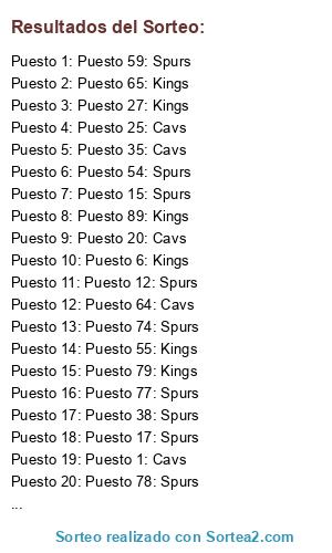 Lista de participantes: Puesto 1: Cavs, Puesto 2: Spurs, Puesto 3: Kings, Puesto 4: Spurs, Puesto 5: Kings, Puesto 6: Kings, Puesto 7: Spurs, Puesto 8: Kings, Puesto 9: Spurs, Puesto 10: Cavs, Puesto 11: Spurs, Puesto 12: Spurs, Puesto 13: Cavs, Puesto 14: Spurs, Puesto 15: Spurs, Puesto 16: Spurs, Puesto 17: Spurs, Puesto 18: Cavs, Puesto 19: Cavs, Puesto 20: Cavs, Puesto 21: Cavs, Puesto 22: Spurs, Puesto 23: Cavs, Puesto 24: Cavs, Puesto 25: Cavs, Puesto 26: Cavs, Puesto 27: Kings, Puesto 28: Cavs, Puesto 29: Spurs, Puesto 30: Kings, Puesto 31: Cavs, Puesto 32: Spurs, Puesto 33: Cavs, Puesto 34: Kings, Puesto 35: Cavs, Puesto 36: Kings, Puesto 37: Kings, Puesto 38: Spurs, Puesto 39: Spurs, Puesto 40: Cavs, Puesto 41: Kings, Puesto 42: Spurs, Puesto 43: Spurs, Puesto 44: Cavs, Puesto 45: Kings, Puesto 46: Cavs, Puesto 47: Spurs, Puesto 48: Cavs, Puesto 49: Cavs, Puesto 50: Cavs, Puesto 51: Kings, Puesto 52: Cavs, Puesto 53: Cavs, Puesto 54: Spurs, Puesto 55: Kings, Puesto 56: Kings, Puesto 57: Kings, Puesto 58: Spurs, Puesto 59: Spurs, Puesto 60: Cavs, Puesto 61: Cavs, Puesto 62: Cavs, Puesto 63: Kings, Puesto 64: Cavs, Puesto 65: Kings, Puesto 66: Cavs, Puesto 67: Kings, Puesto 68: Spurs, Puesto 69: Spurs, Puesto 70: Spurs, Puesto 71: Spurs, Puesto 72: Spurs, Puesto 73: Kings, Puesto 74: Spurs, Puesto 75: Spurs, Puesto 76: Spurs, Puesto 77: Spurs, Puesto 78: Spurs, Puesto 79: Kings, Puesto 80: Cavs, Puesto 81: Kings, Puesto 82: Kings, Puesto 83: Kings, Puesto 84: Kings, Puesto 85: Cavs, Puesto 86: Spurs, Puesto 87: Cavs, Puesto 88: Spurs, Puesto 89: Kings, Puesto 90: Spurs, Puesto 91: Kings, Puesto 92: Cavs.