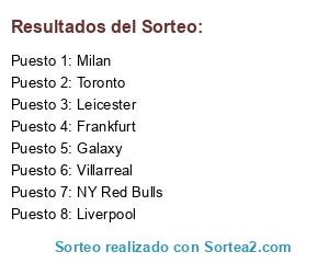 Lista de participantes: Galaxy, Toronto, Frankfurt, NY Red Bulls, Milan, Leicester, Villarreal, Liverpool.