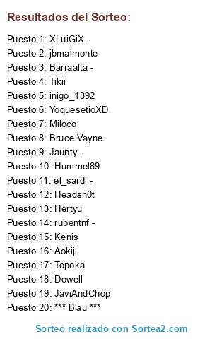 Lista de participantes: *** Blau *** , Topoka, Miloco, Hertyu, Hummel89, Aokiji, Kenis, jbmalmonte, Bruce Vayne, Headsh0t, Dowell, JaviAndChop, inigo_1392, Tikii, YoquesetioXD, el_sardi -, XLuiGiX -, rubentnf -, Jaunty -, Barraalta -.
