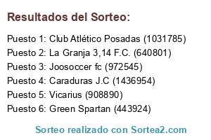 Lista de participantes: Club Atlético Posadas (1031785), Vicarius (908890), Caraduras J.C (1436954) , La Granja 3,14 F.C. (640801), Joosoccer fc (972545) , Green Spartan (443924).